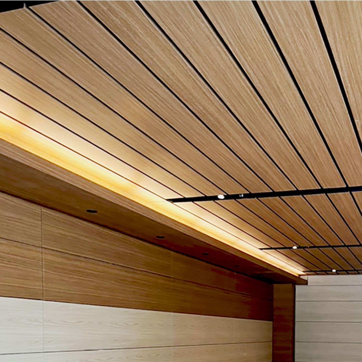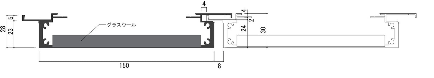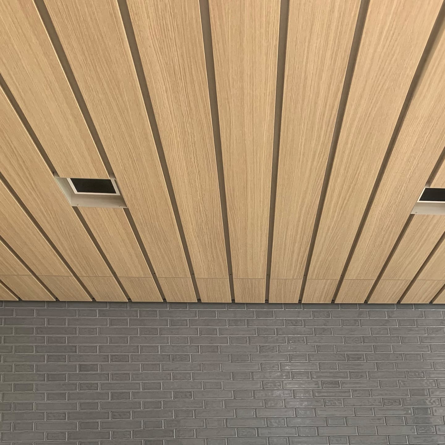化粧塩ビシートとアルミ板を有孔加工し、背後にグラスウールを配置したパネルです。壁面や天井に捨て貼りした面に接着工法による施工を基本としています。